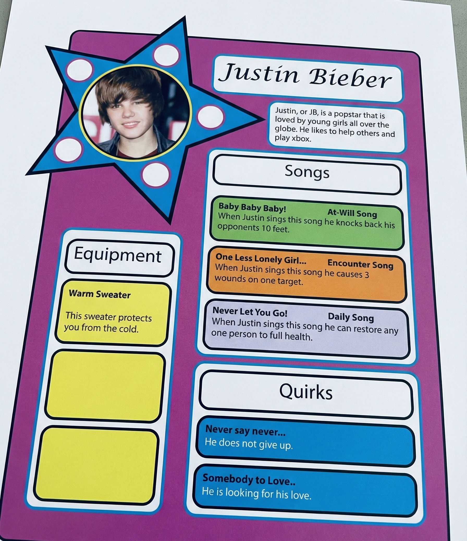 - Bieber Fever! (That’s exactly what it sounds like, a Justin Bieber-based game, filled with pop icons and references. See the character sheet above!)
