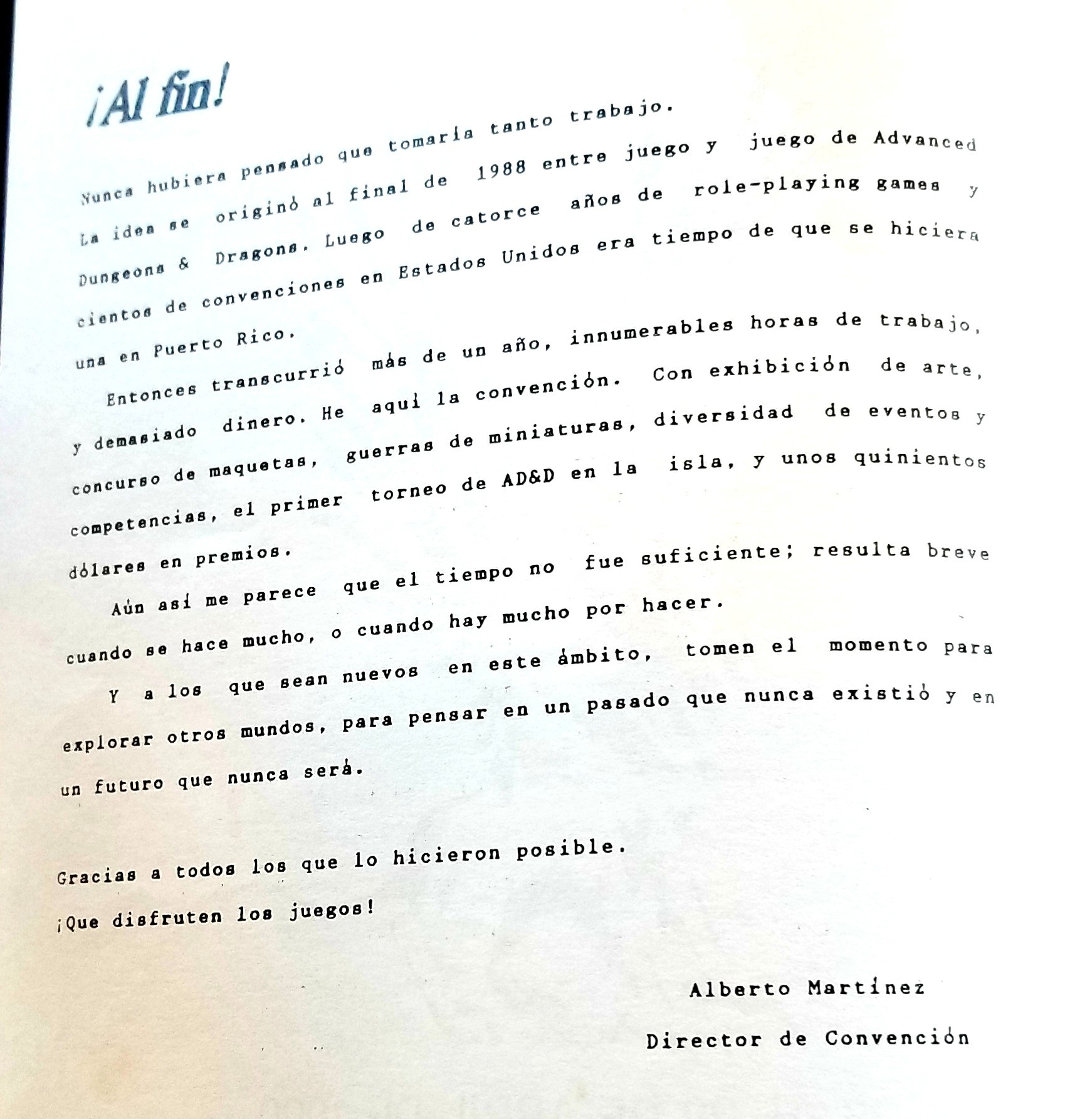 I never imagined it would take this much work. The idea was born in late 1988, between sessions of Advanced Dungeons & Dragons. After fourteen years of playing RPGs and attending hundreds of conventions in the US, it was time for Puerto Rico to have its own.