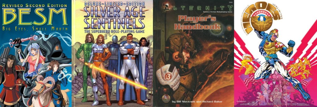 We also dabbled in variations of Big Eyes, Small Mouth, the Silver Age Sentinels system, and its Tri-Stat dX versions. Alternity was a short but incredibly important game for me during this era. I also kept going back to Palladium to try and make the system work for us; aside from Heroes Unlimited, I was growing weary of Rifts and their other titles.